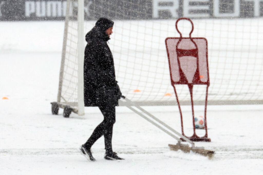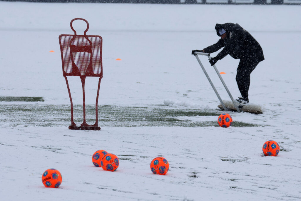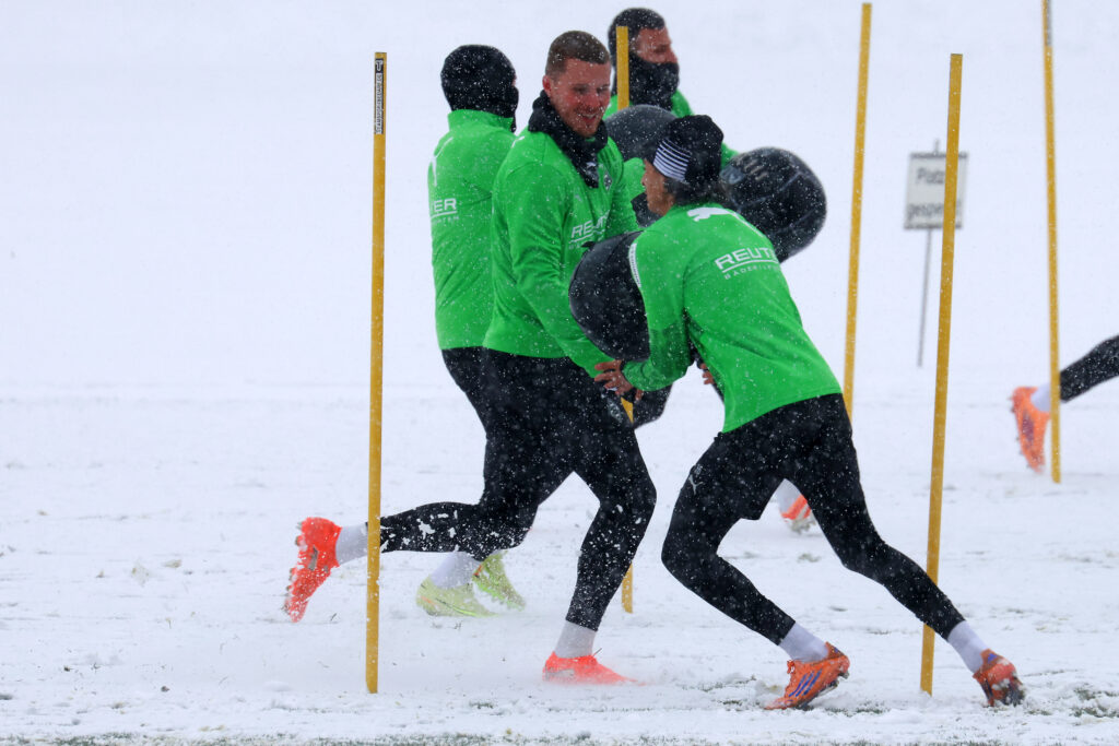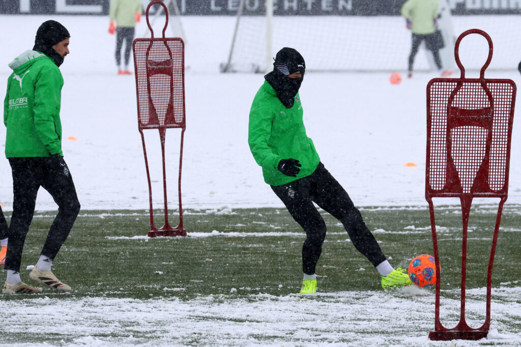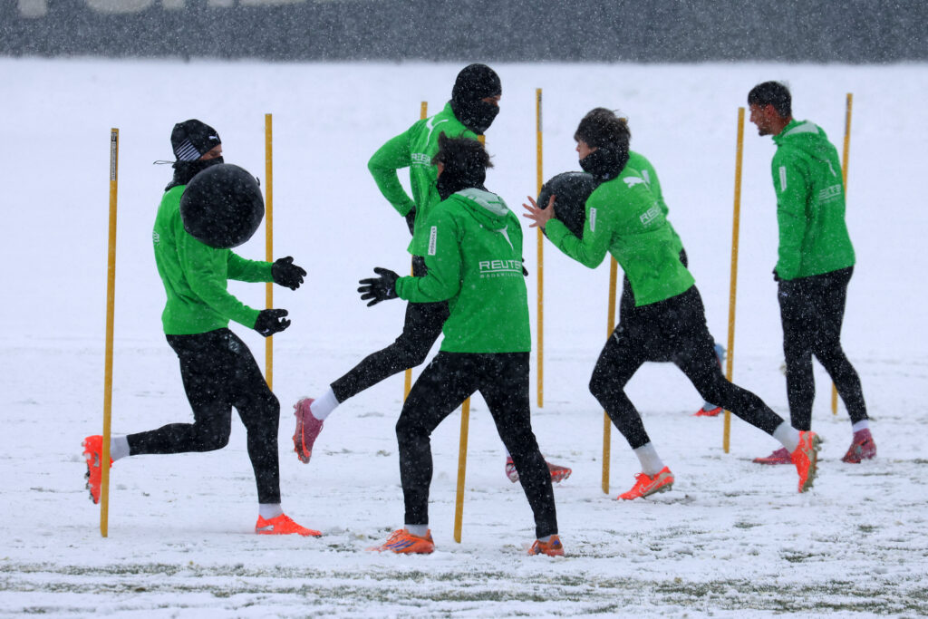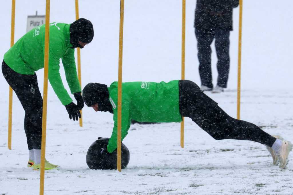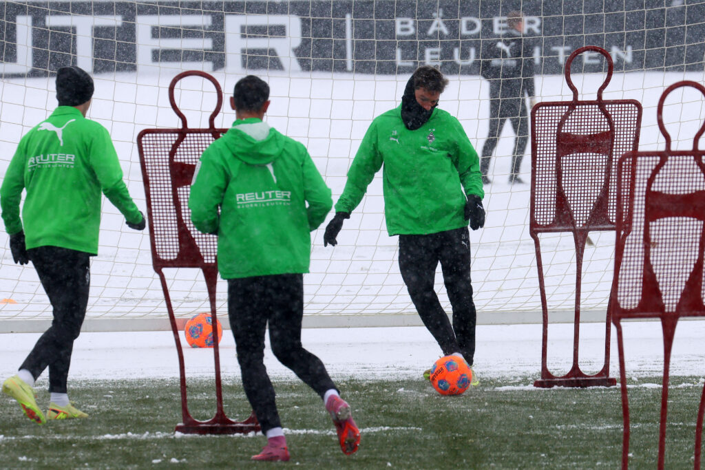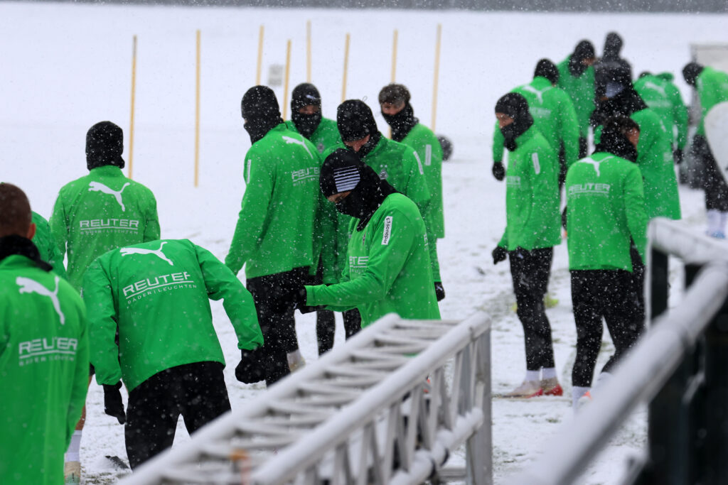 Die Borussen trainierten am Mittwoch bei starkem Schneefall. Foto: Dirk Päffgen